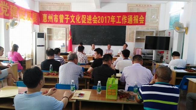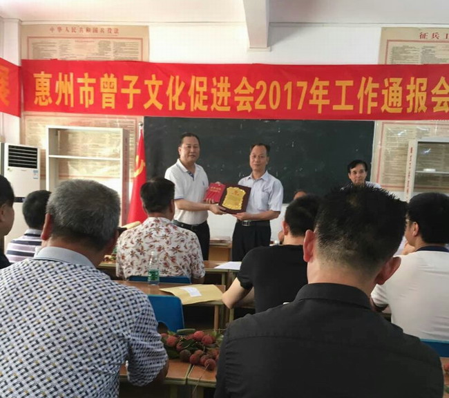 2017年6月29日下午,惠州市曾子文化促进会在惠城区三栋镇坝山口村委会会议室召开2017年工作通报会,促进会领导、各县、区代表共50多人参加了会议,秘书长曾子彬主持了会议。 会议首先为大岚曾柏棠宗亲颁发了对曾子纪念馆,会馆开馆时捐款五万元的功德匾牌和荣誉证书。 会上各县、区代表汇报了2016年的宗亲工作情况,促进会理事长曾金桥在会上总结了惠州市曾子文化促进会2016年度工作情况,他说,2016年惠州市曾子文化促进会主要做了如下几项工作:一是全力以赴完成曾子纪念馆的建设开馆及市曾子文化促进会挂牌;二是办好惠州首届曾子文化研讨会;三是多种形式开展曾子文化传承活动。同时,他还通报了2017年的工作计划,他说,2017年惠州市曾子文化促进会要做好如下几项工作:一是积极配合做好《寻根问祖》电视栏目的拍摄工作;二是积极主动,继续开展国学讲座教育活动;三是继续开展扶贫助困助学公益活动;四是积极做好纪念曾子2522周年祭典活动的准备工作;五是积极配合,做好省曾子文化研究会组织开展的全省修谱活动工作;六是继续完善纪念馆、会馆文化设施配套工作;七是发展扩大曾子文化促进会会员;八是规范制定促进会、理事会运作机制,会馆管理机制。